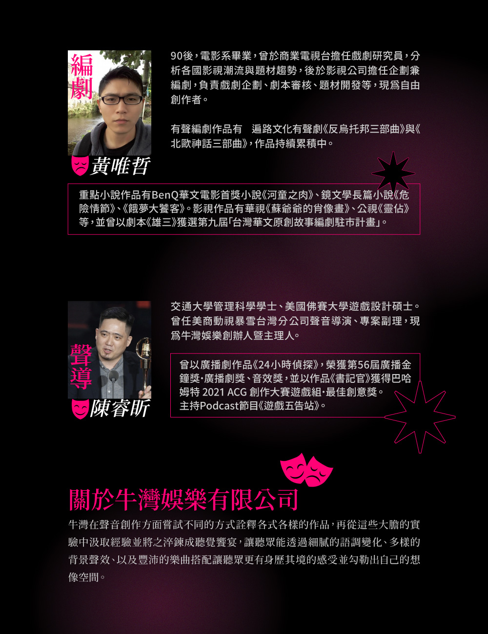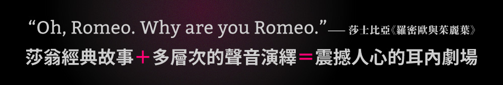 邀請十多位專業聲音演員詮釋演繹,幫助你深入角色內心,共感其苦澀、悸動、渴求、悲慟等多重情緒。並藉由音效的輔助,在腦內搭建出屬於你的莎劇場景。