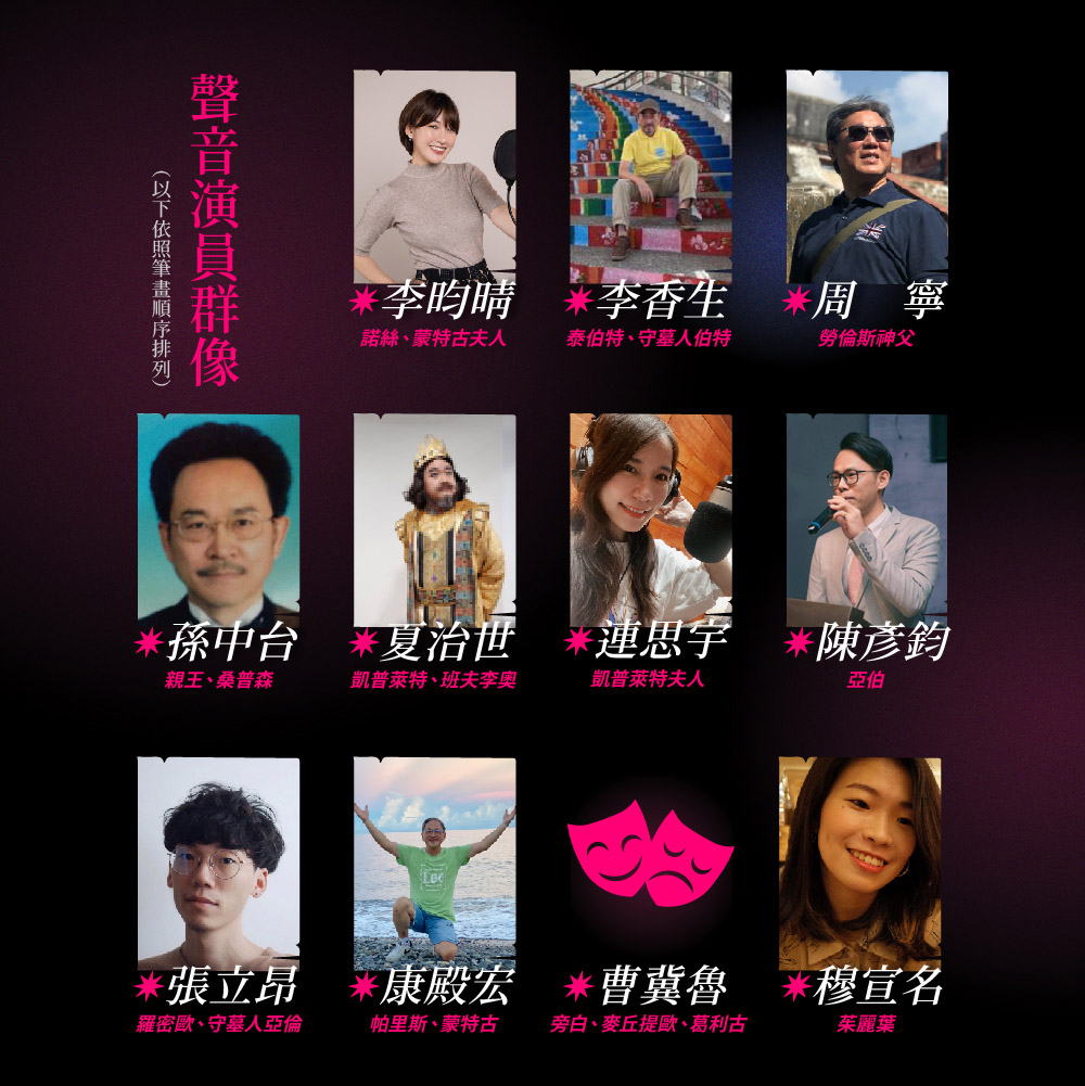 故事的兩大主人翁分別由張立昂和穆宣名飾演。立昂飾演過許多動畫的高中生男角,在年輕的聲音詮釋下仍不失貴氣,呈現出羅密歐那任性、真摯又勇敢的少年情操;而擔任茱麗葉的宣名,聲線輕盈有朝氣,表演方式極富炫染力,將少女情懷詮釋得淋漓盡致。聽著他們的堅定與勇敢,或能召回愛情純粹的本質,重拾當初那個為了愛、追求夢,即便遍體麟傷、身陷險境,也要奮不顧身的自己。