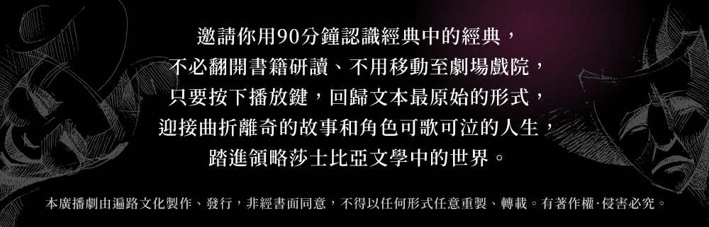 如果你曾擔心劇本不好閱讀、害怕莎士比亞影射寓意的晦澀難懂,本系列經由編劇梳理修裁,一轉原著劇本形式的艱深,調整成最適合聆聽的現代版本,會是你接觸莎翁作品的第一扇門。