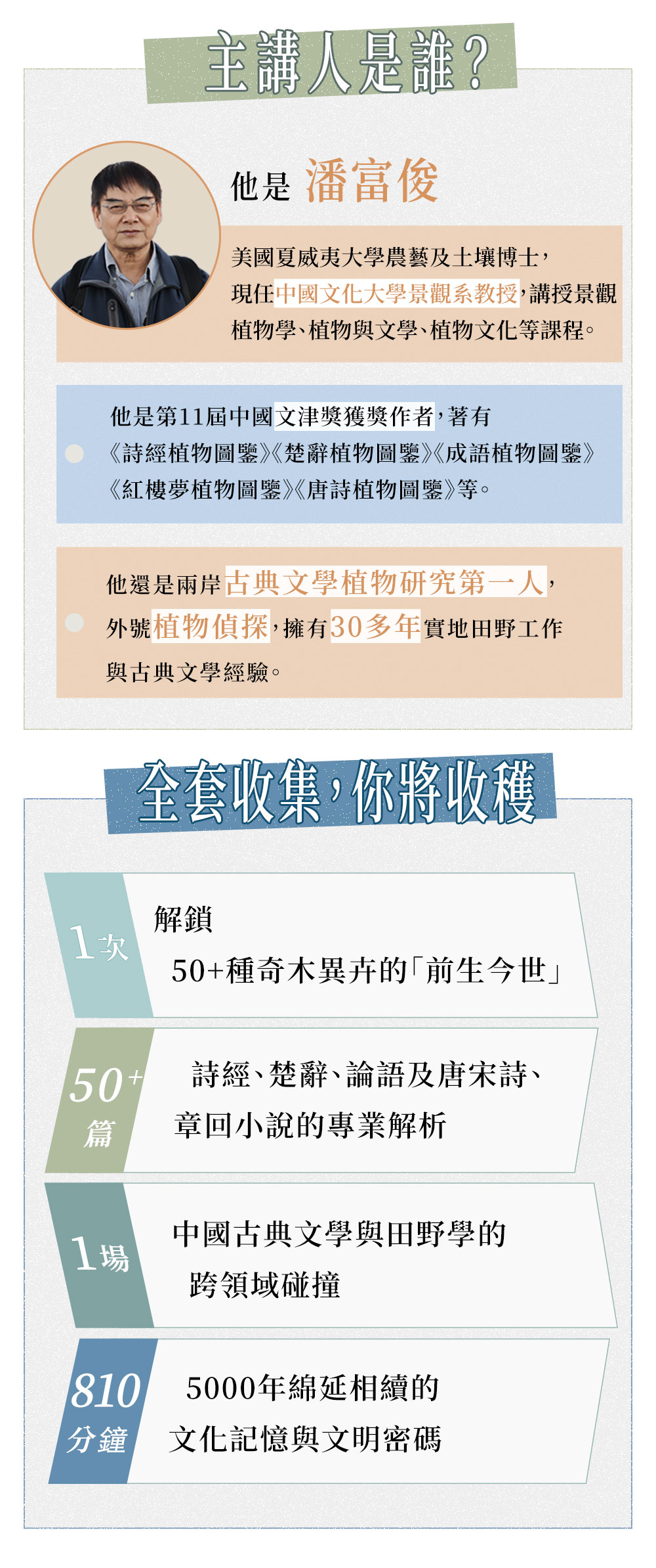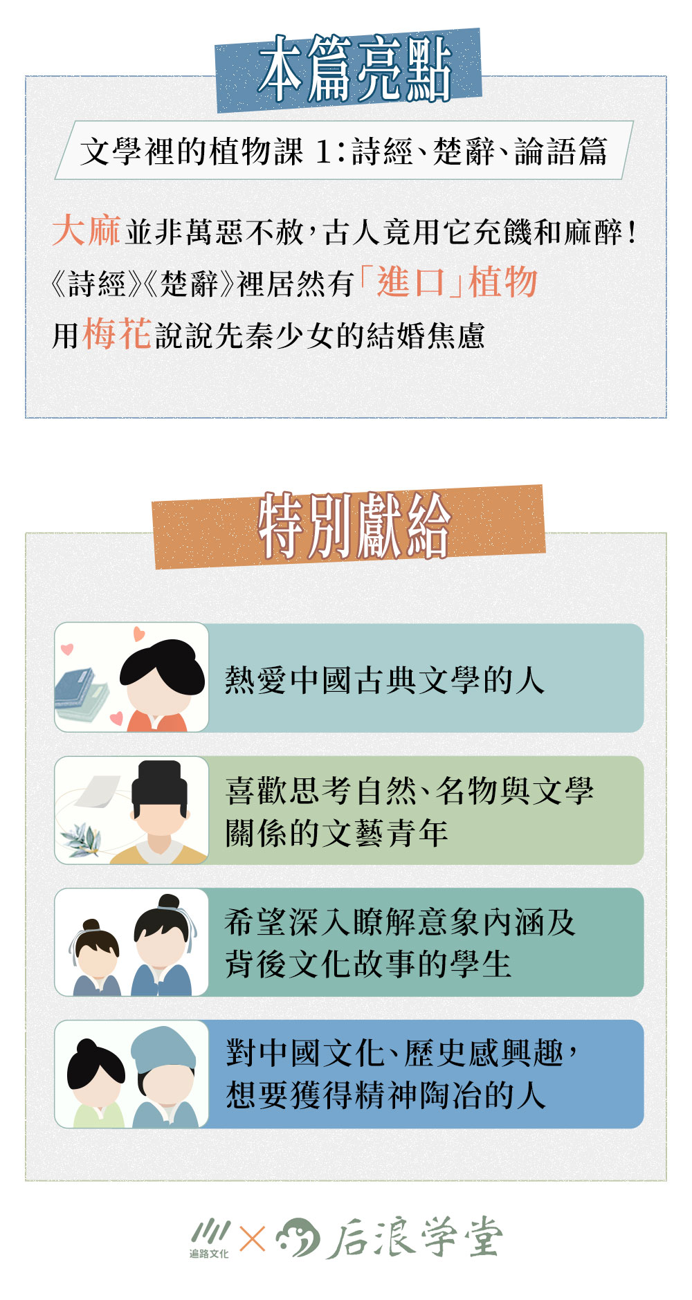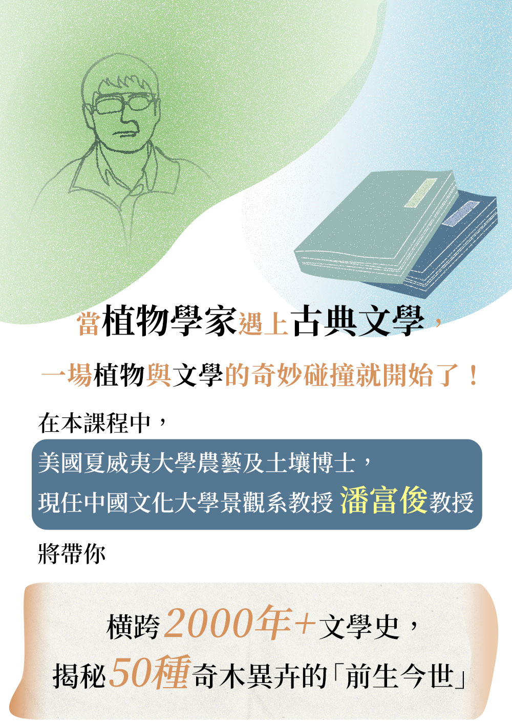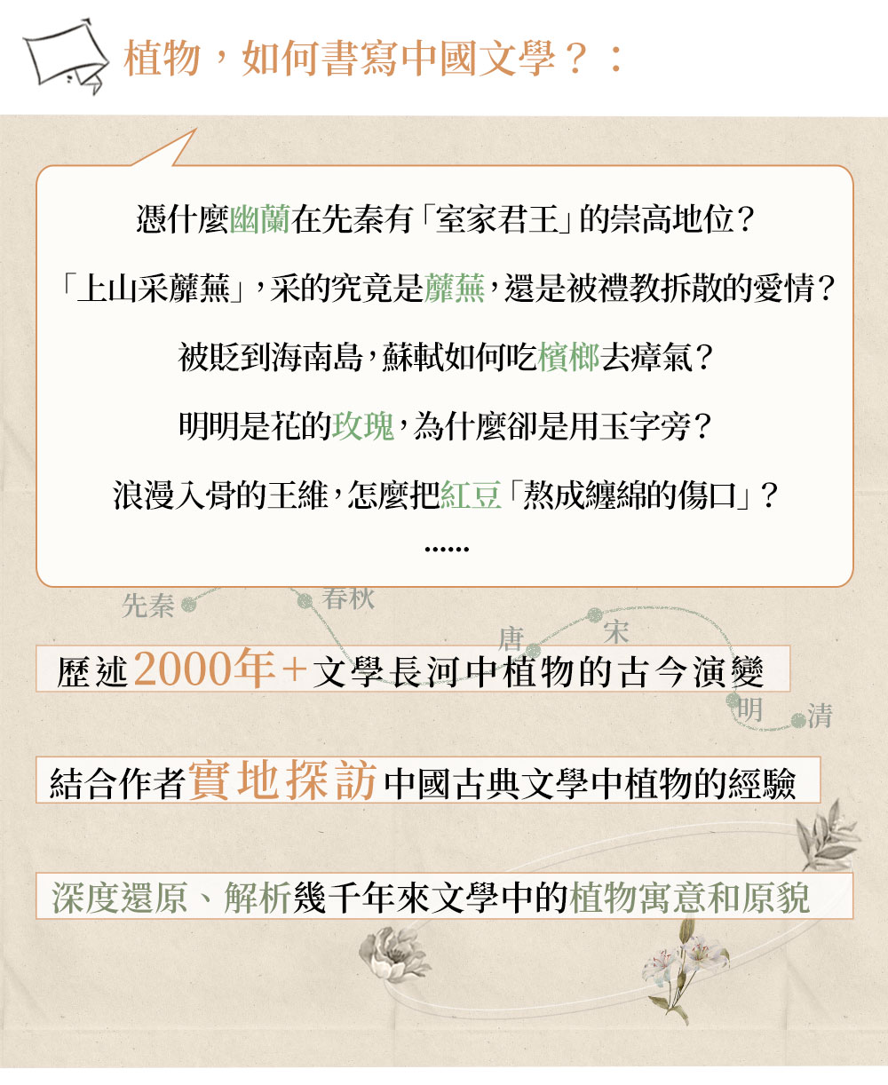 人心躁動的世道,文學與芳草聊可撫慰,聽潘老師娓娓解讀數千年來潛藏文字當中的植物花草,共同品讀經典,必可從中嗅得芝蘭之香。