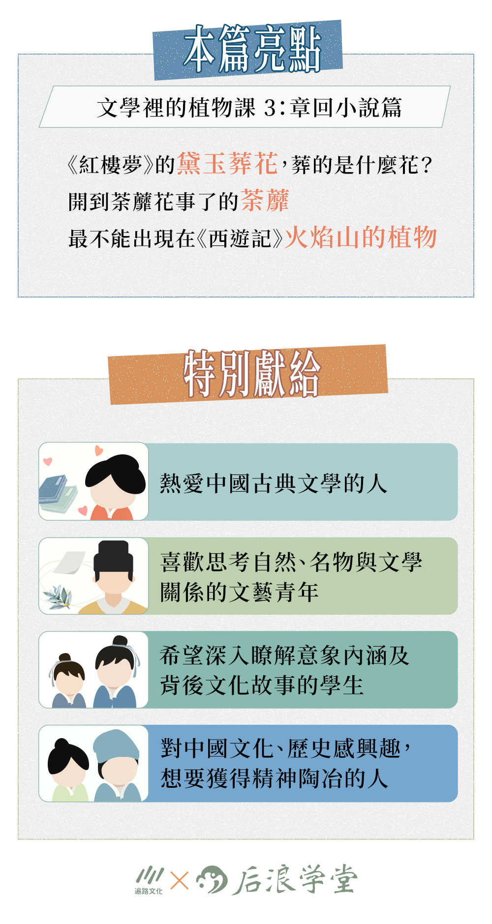 人心躁動的世道,文學與芳草聊可撫慰,聽潘老師娓娓解讀數千年來潛藏文字當中的植物花草,共同品讀經典,必可從中嗅得芝蘭之香。