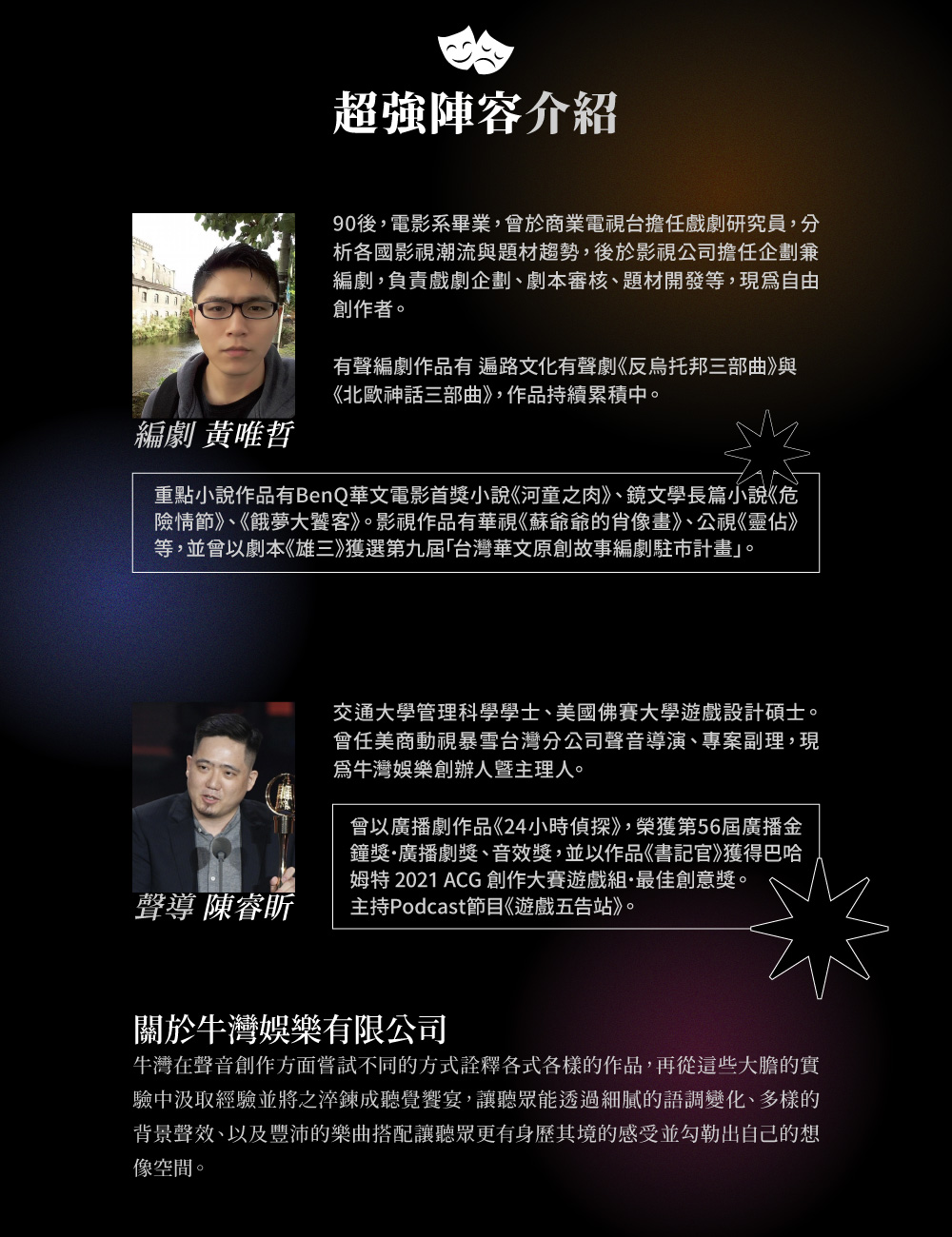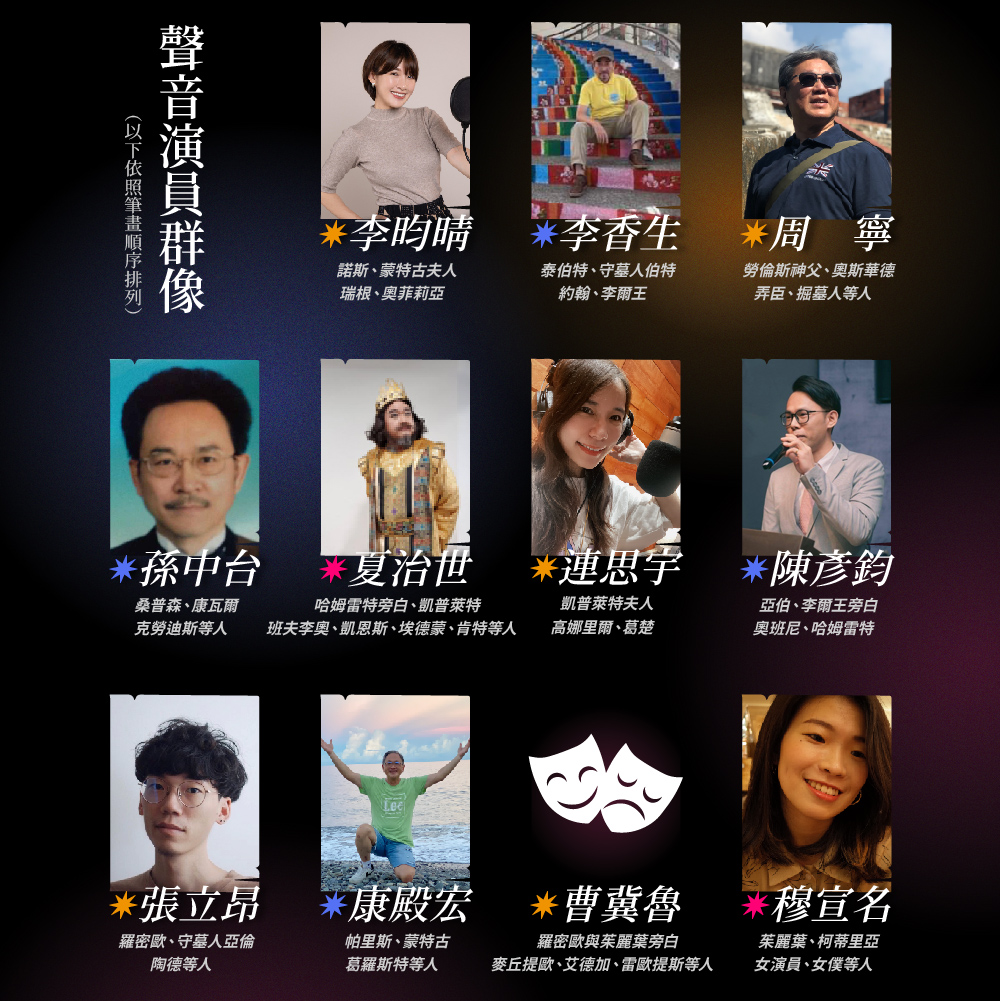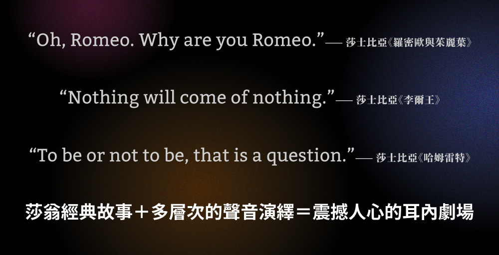 邀請十多位專業聲音演員詮釋演繹,幫助你深入角色內心,共感其苦澀、悸動、渴求、悲慟等多重情緒。並藉由音效的輔助,在腦內搭建出屬於你的莎劇場景。