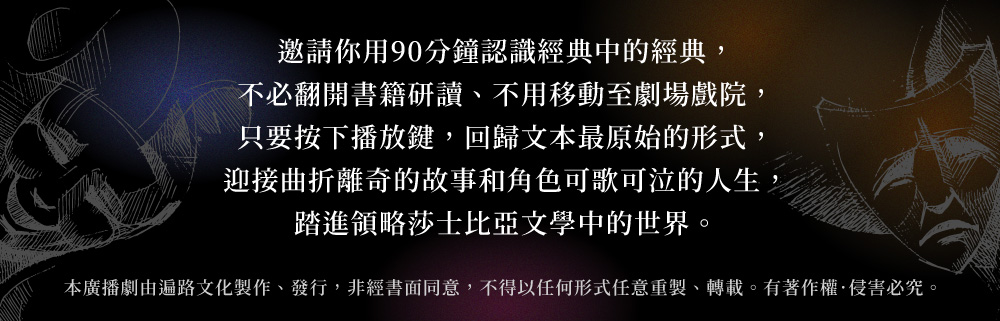 如果你曾擔心劇本不好閱讀、害怕莎士比亞影射寓意的晦澀難懂,本系列經由編劇梳理修裁,一轉原著劇本形式的艱深,調整成最適合聆聽的現代版本,會是你接觸莎翁作品的第一扇門。