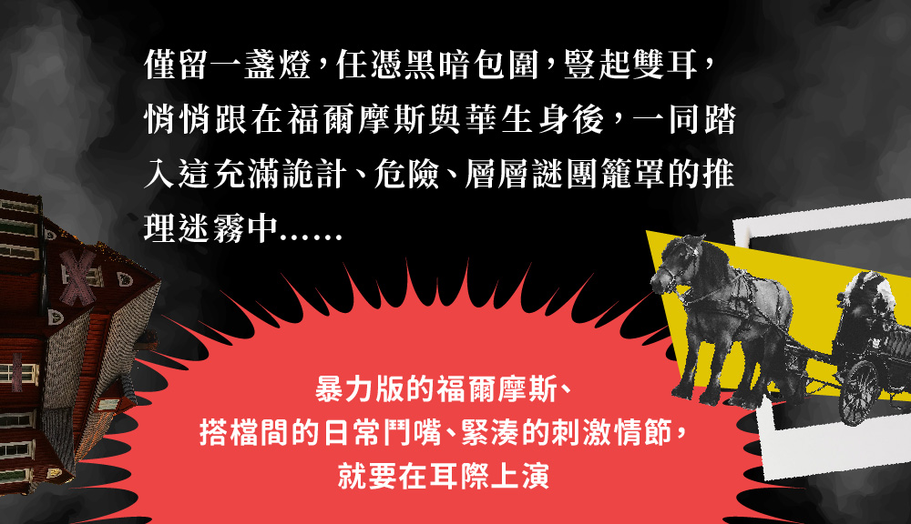 由專業聲導選角,邀請8名配音員獻聲,包括為各知名戲劇、遊戲配音的一線聲音演員,如動畫《進擊的巨人》主角艾連、宮崎駿《借物少女艾莉緹》的艾莉緹,還有手遊《未定事件簿》的左然等;再加上音效的畫龍點睛,讓心隨著情節高潮迭起,彷彿置身維多利亞後期的倫敦,跟隨福爾摩斯走訪案件現場。