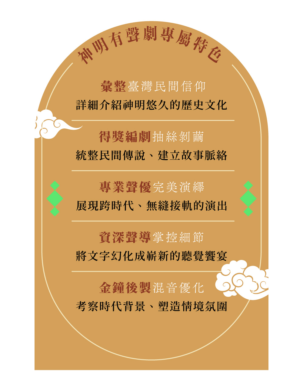 「認識臺灣神明系列有聲劇」特別精選生活中最常接觸的六大神明,包括媽祖、土地公、城隍爺、關公、保生大帝,還有對客家人擁有崇高地位的三山國王、開漳聖王,以及義民爺;本系列結合劇本的情節巧妙安排,與臺籍配音員的聲音演繹,表現出有質感且現代化的在地文化特色,適合全臺灣人閱聽。
