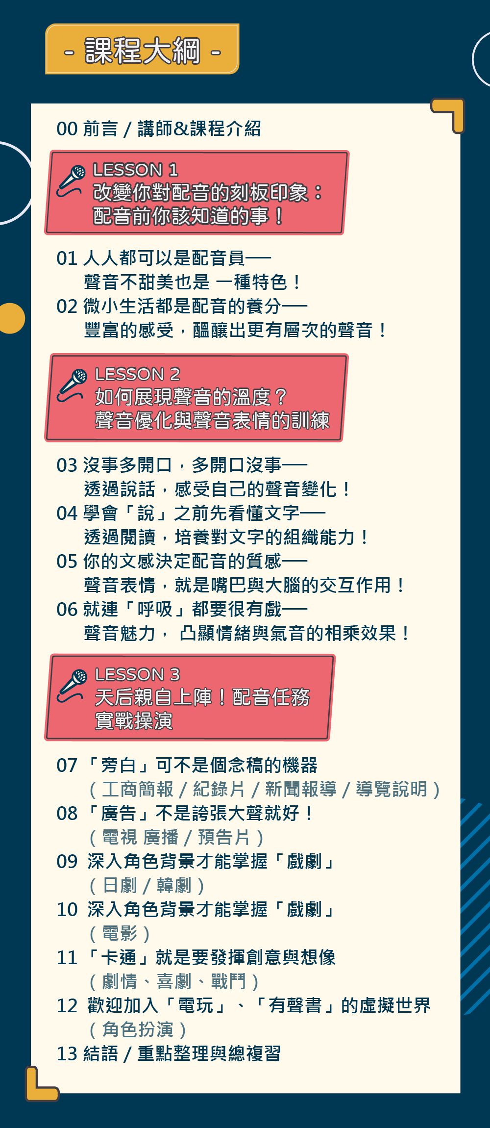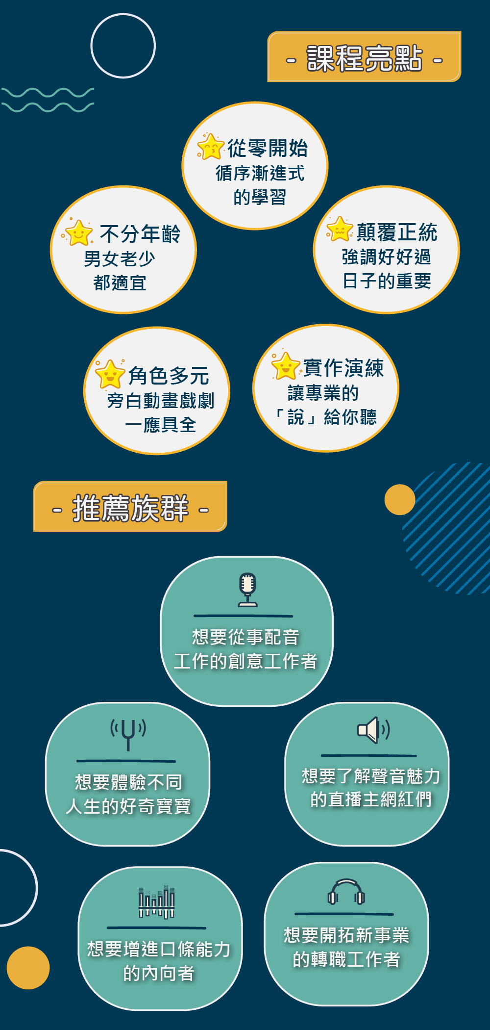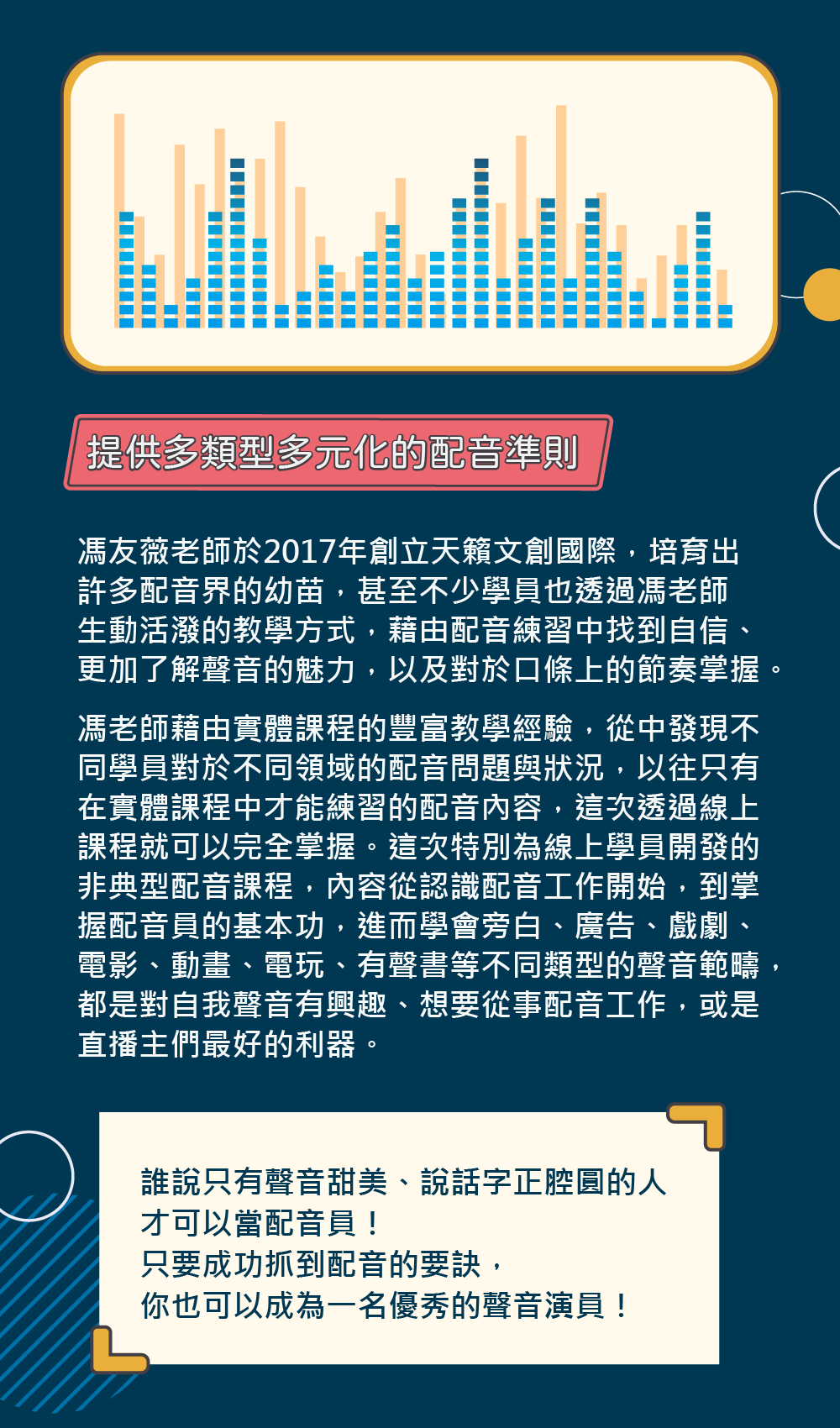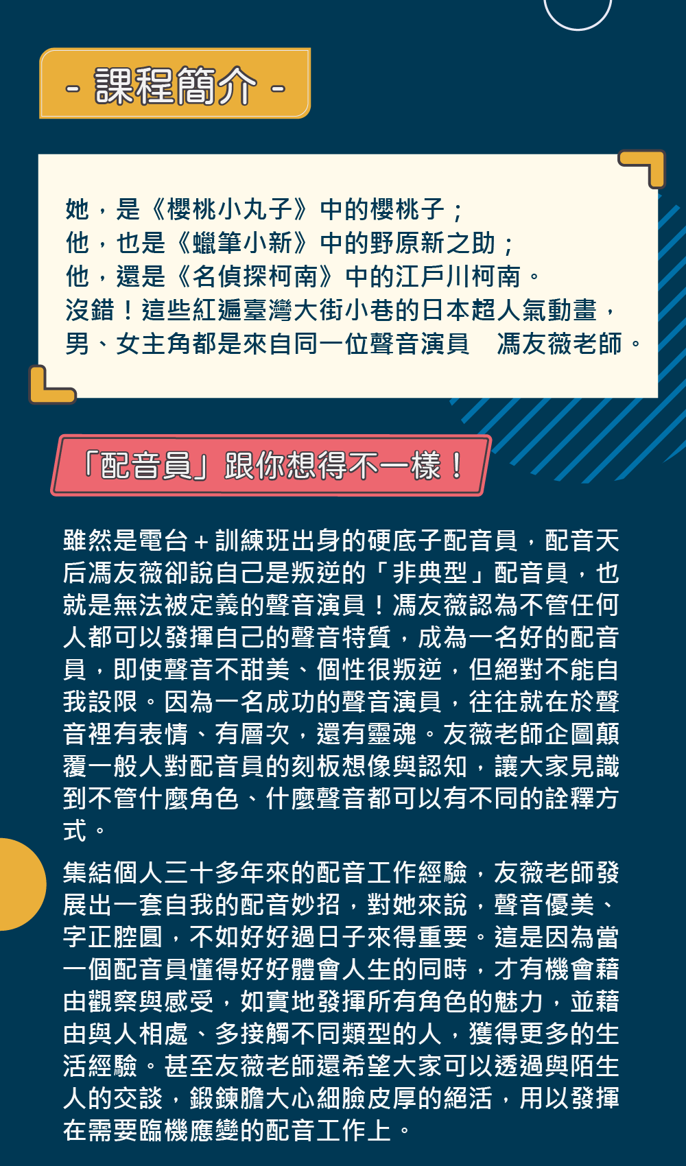 透過一對一的指導示範,精進動畫、戲劇、有聲書、導覽的配音功力