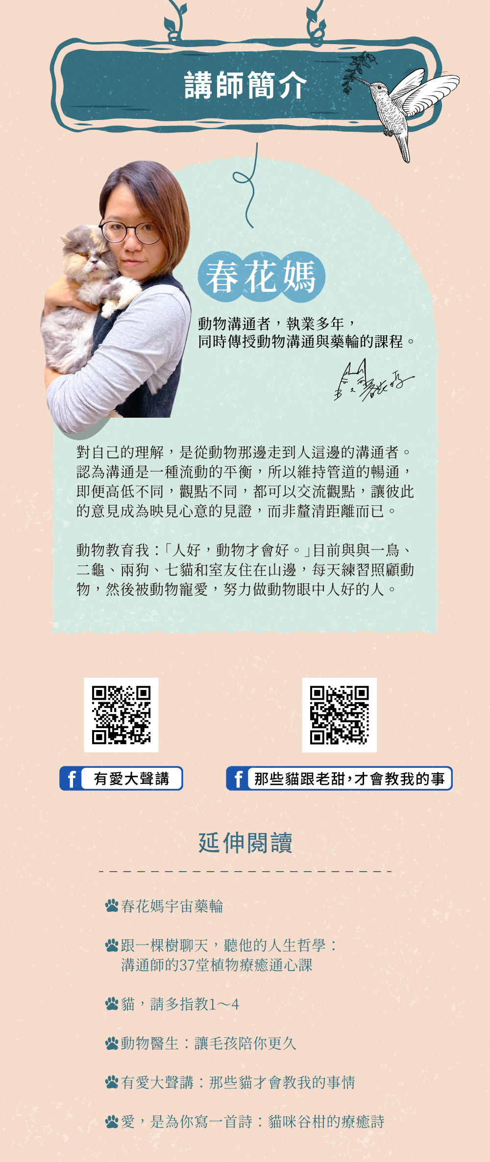 ( 動物溝通者、作者、「有愛大聲講」臉書專頁主人 )