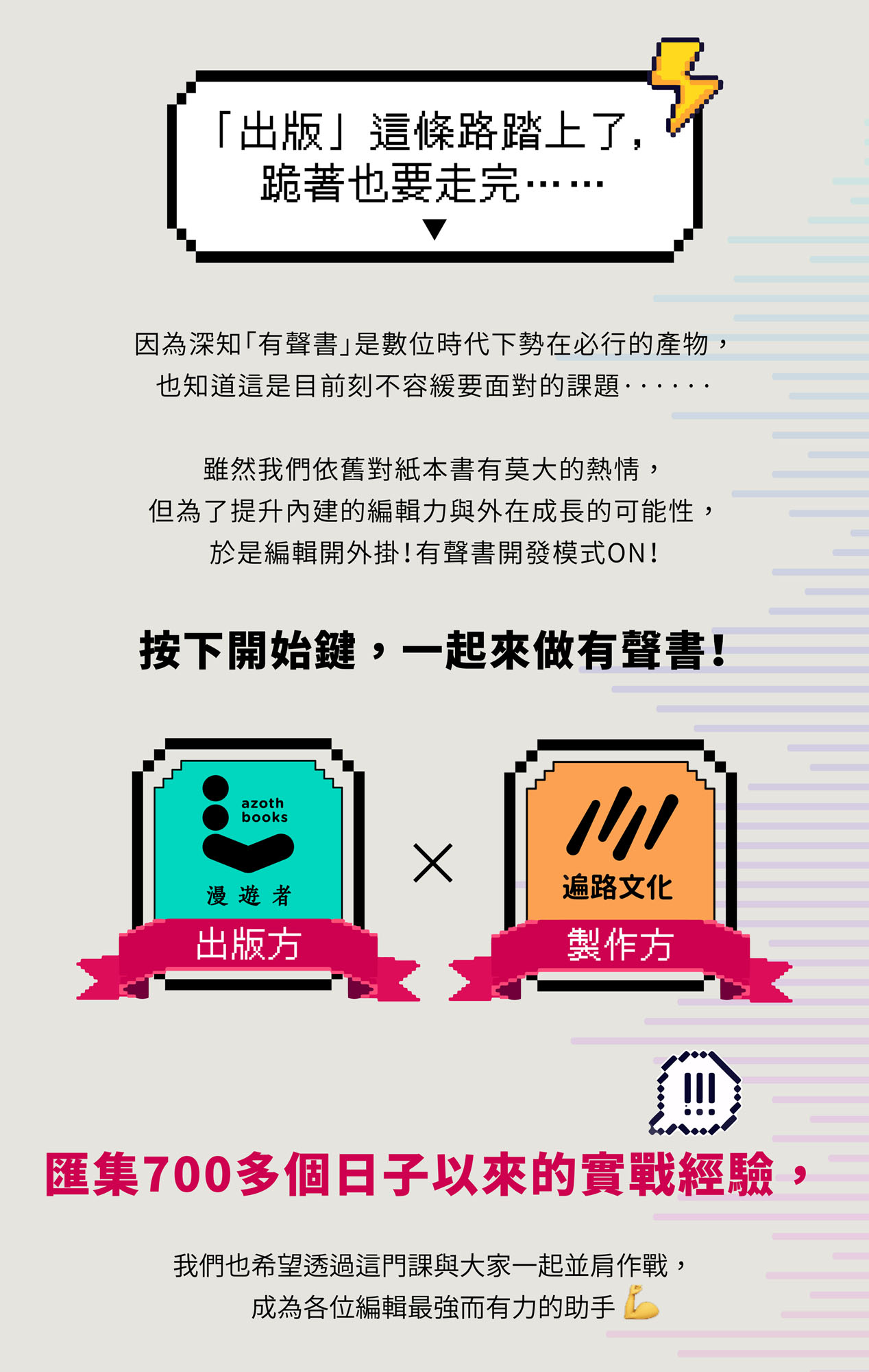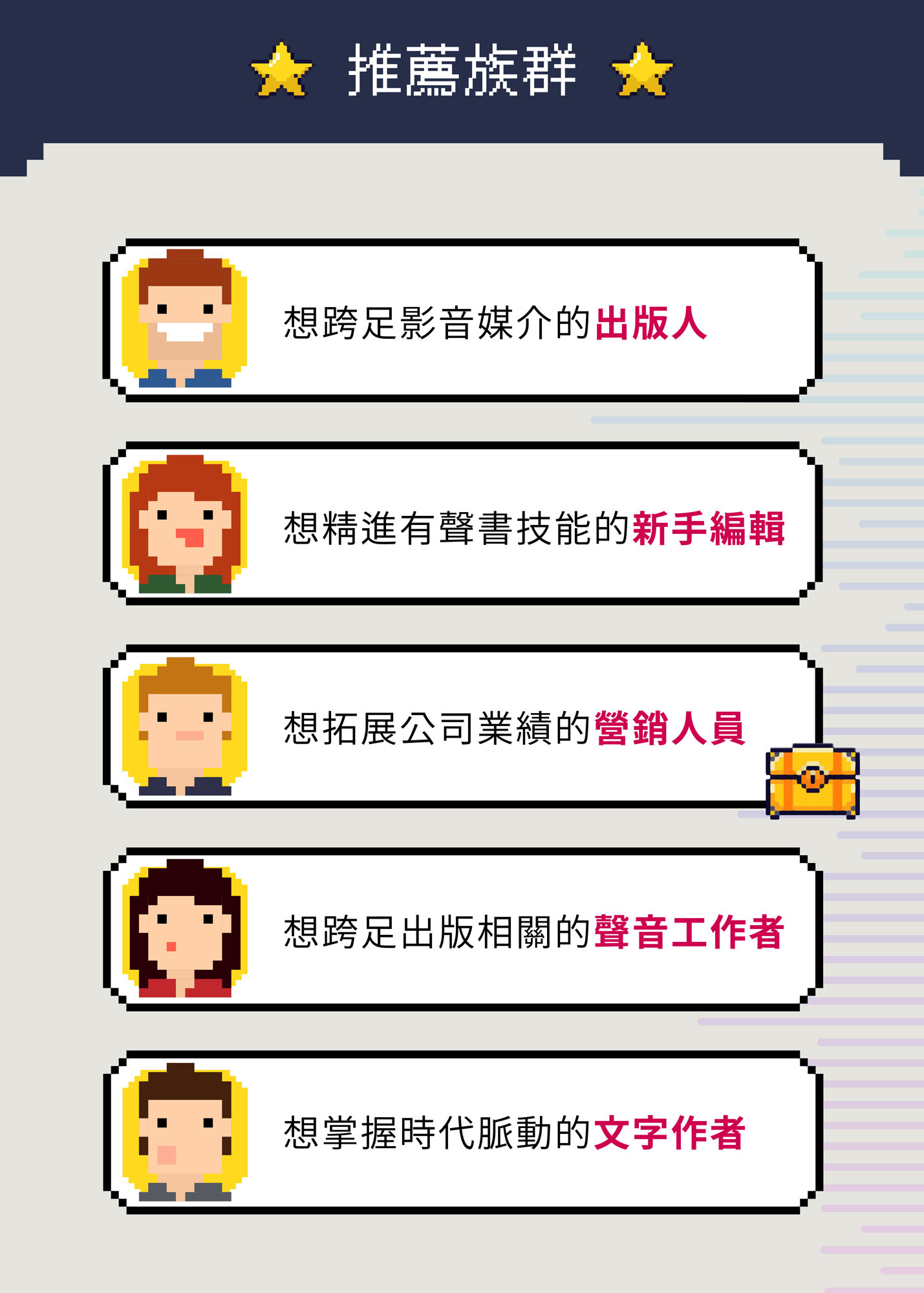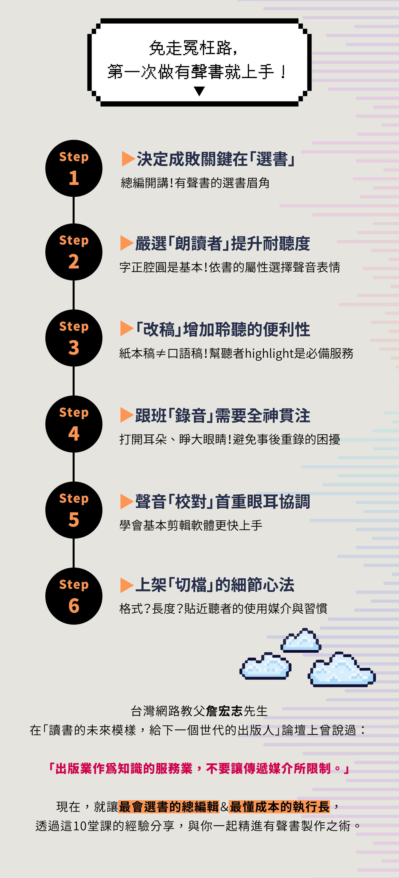 社團內可針對課程內容、有聲書製作時所遇到的問題提問,版主將統一彙整給講師, 並儘快回覆給各位。社團內,我們也將會不定期分享最新的中文有聲書資訊,也歡迎學員間互相交流,分享製作有聲書的酸甜苦辣。