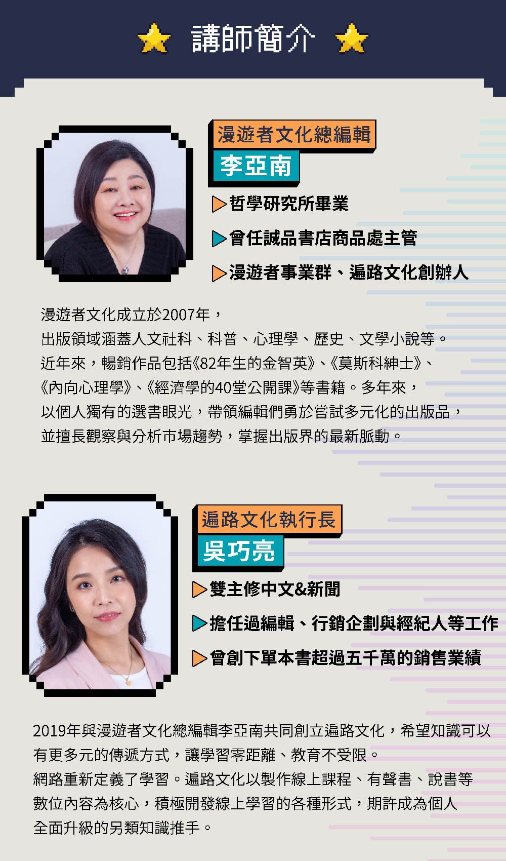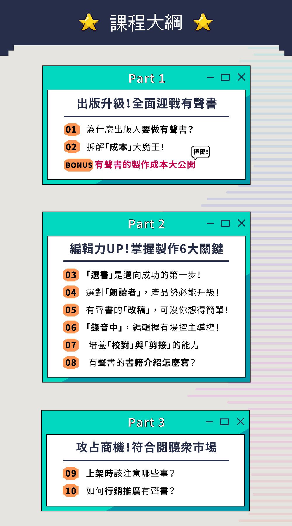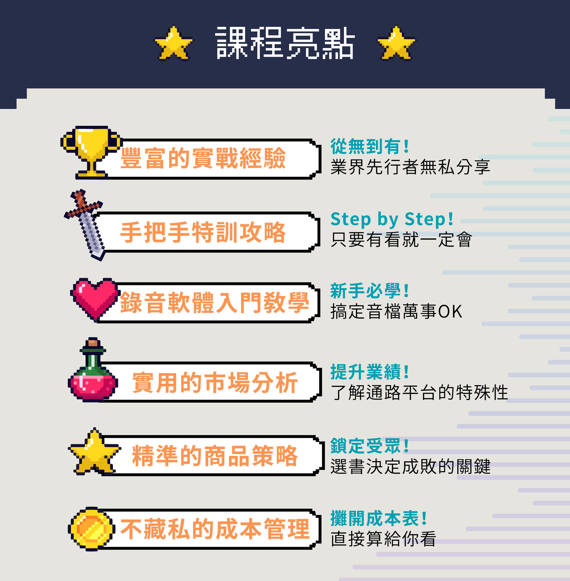 社團內可針對課程內容、有聲書製作時所遇到的問題提問,版主將統一彙整給講師, 並儘快回覆給各位。社團內,我們也將會不定期分享最新的中文有聲書資訊,也歡迎學員間互相交流,分享製作有聲書的酸甜苦辣。