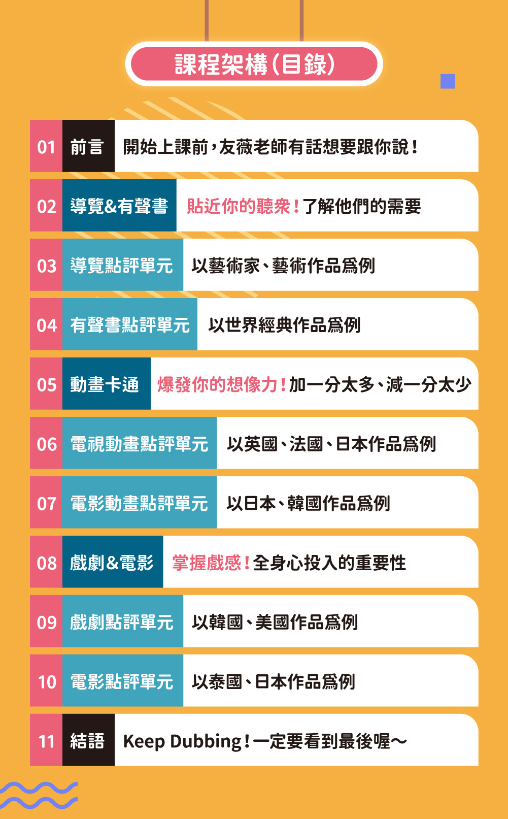 詮釋過上萬名的角色,馮友薇老師將自己三十多年來的配音經驗,以及從事聲音導演的領略與觀察,毫無保留、全數傾囊相授。除了一般配音員該掌握的基本技巧外,在這門課裡,你也可以學會最難表達的氣音、恰如其分的反應聲,以及配音時該知道的所有眉角、絕學!