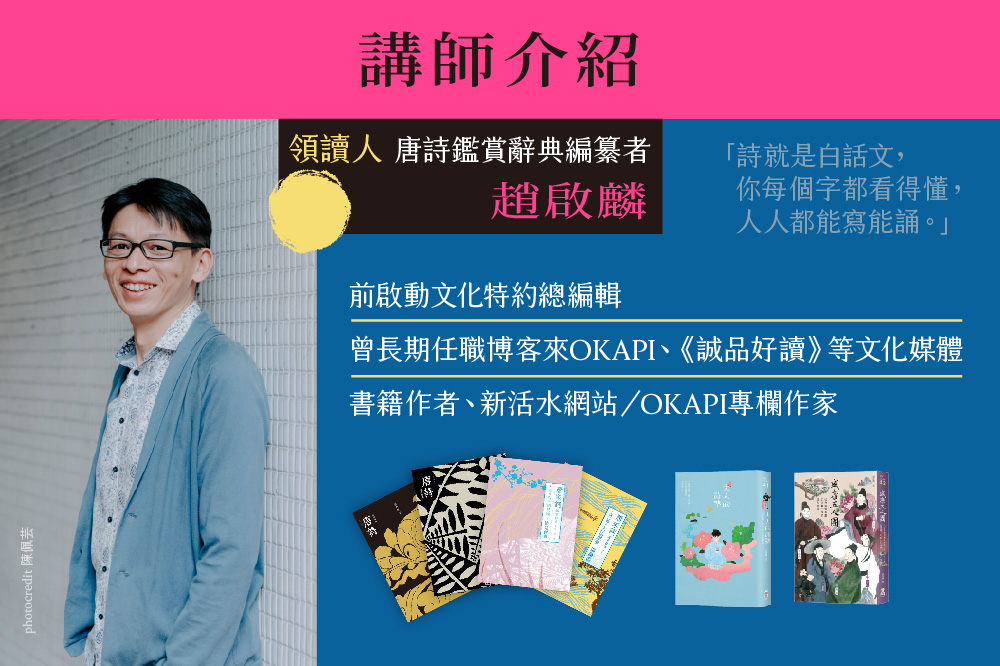 這門課程,將由最熟唐詩的趙啟麟,帶你循著三位詩人的生命途徑,看他們如何將人生入詩,在面臨各種大關卡做出的抉擇,或許你會發現,這些詩人和你想的不太一樣。