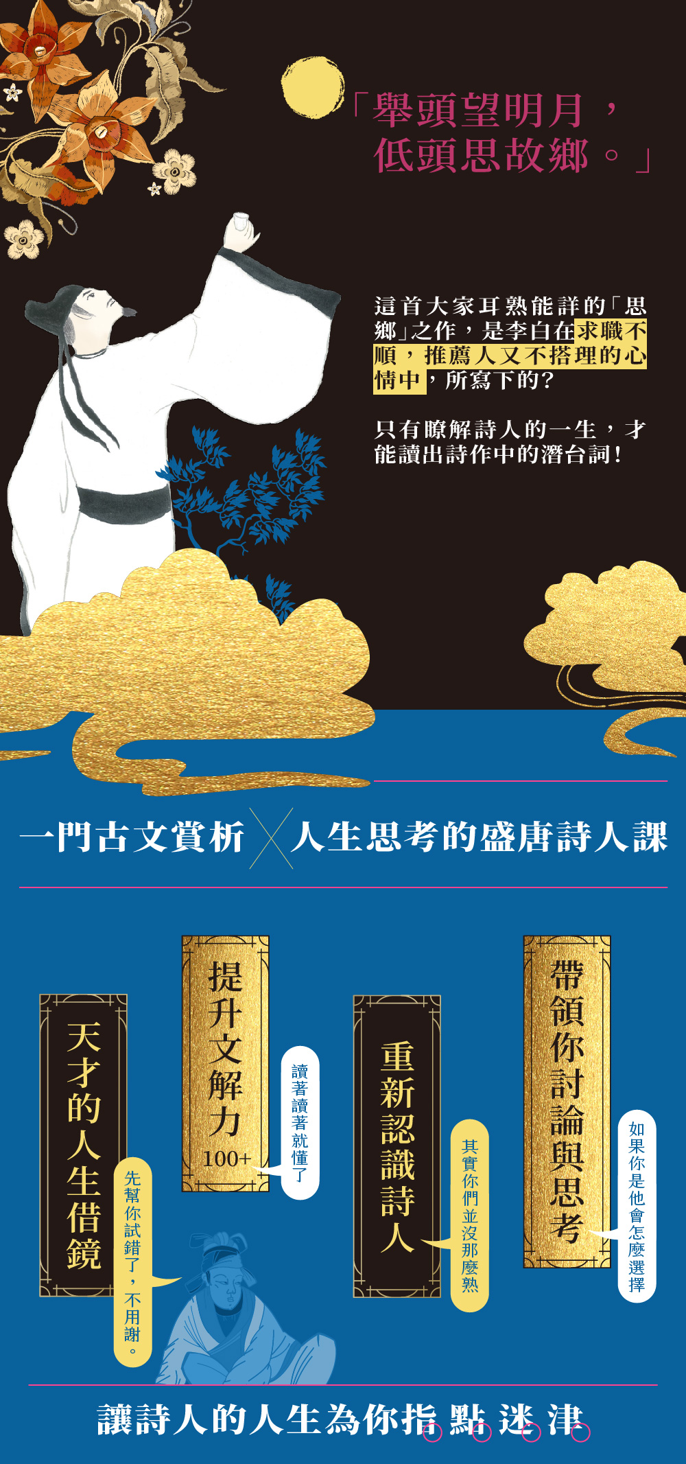 你可以隨著老師的講解,不逐字糾結於形音義,而是回到時空脈絡中,瞭解詩人的經歷和個性,解鎖詩作背後的密碼、體會天才對世界的感受,想像如果詩人生活在現代,他會以什麼樣的形象出現在文壇?