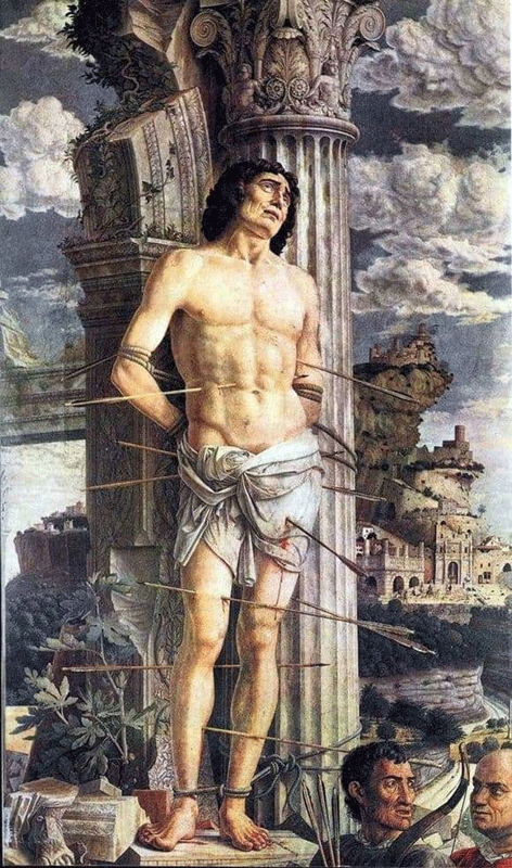 《聖賽巴斯提昂》,曼帖尼亞,1456–1459,蛋彩、木板,68 × 30 cm,收藏於藝術史博物館(Kunsthistorisches Museum),奧地利維也納