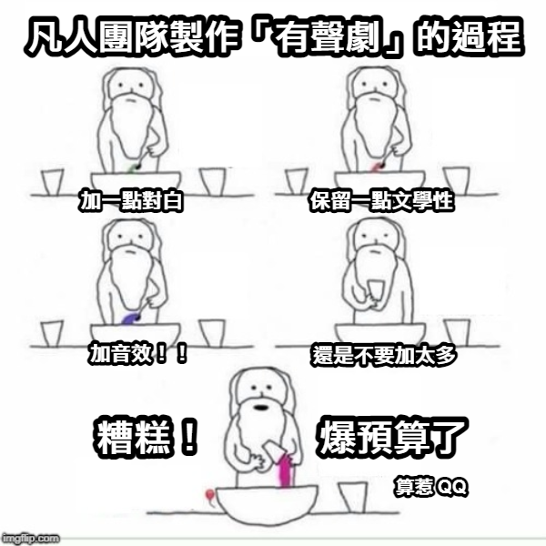 到了後製階段,編輯又再是否加音效、加多少的苦惱中來回思量,太多搶戲、太少無力,而第一次推出有聲劇,為了幫助融入情境,儘管早已超出預算,我們仍請音樂人Kevin Chen、Lucas Lee (李皓軒)創作了三首主題曲;種種努力,都是希望能帶給各位聽眾、讀者一場全新的聽覺體驗,至於「多少」的問題也將交由你們來決定,歡迎告訴我們你的建議。