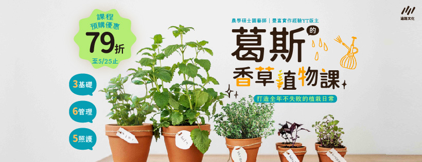 就在小編決定洗心革面、放棄黑手指的宅生活時,赫然在YT上遇到了香草大神→→「葛斯」!因為不囉嗦的教學方式、加上擅長運用鏡頭說話,不知為何好像任何難解的種植問題都變得簡單、艱深的專有名詞也變得平易近人了。如果你也跟小編一樣喜歡香草植物,如果你也曾背負黑手指的盛名,在此我誠心推薦給你~希望透過葛斯的專業「植」覺力,可以幫助你更新香草世界的資料庫,更加健全你的全方位種植系統。